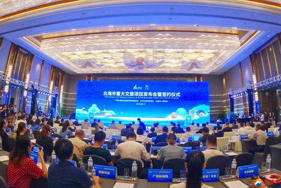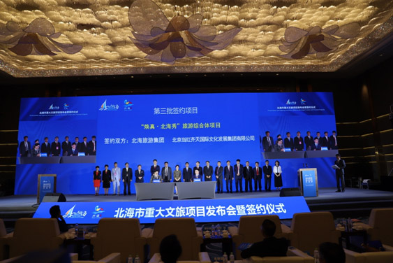 2018年9月11日,第十五届东博会在广西南宁正式开幕。广西壮族自治区旅游发展委员会、中共北海市委员会、北海市人民政府联合主办的北海市重大文旅项目发布会暨签约仪式于同期召开。广西壮族自治区政协副主席、工商联主席磨长英、自治区旅游发展委主任甘霖、北海市委书记王乃学、市长蔡锦军等领导出席了发布会暨签约仪式。